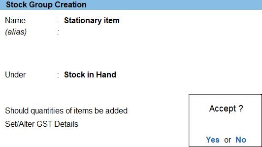 Stock Groups in Inventory are similar to Groups in Accounting Masters. They are helpful in the classification of Stock Items. You can group Stock Items under different Stock Groups to reflect their classification based on some common features such as brand name, product type, quality, and so on. Grouping enables you to locate Stock Items easily and report their details in statements.