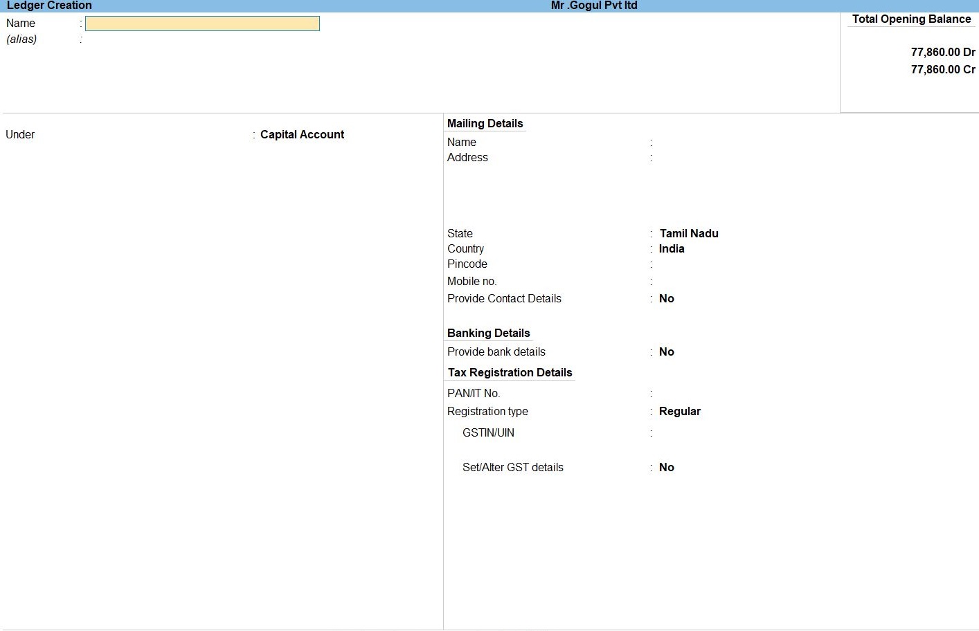- Press Alt+G (Go To) -> Create Master -> type or select Ledger and press Enter.