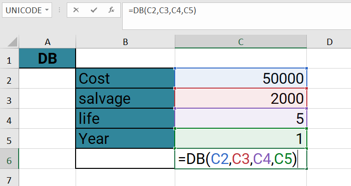 The formula "=DB(C2,C3,C4,C5)" is using the DB function in Excel to calculate the depreciation of an asset for a specific period, based on the declining balance method