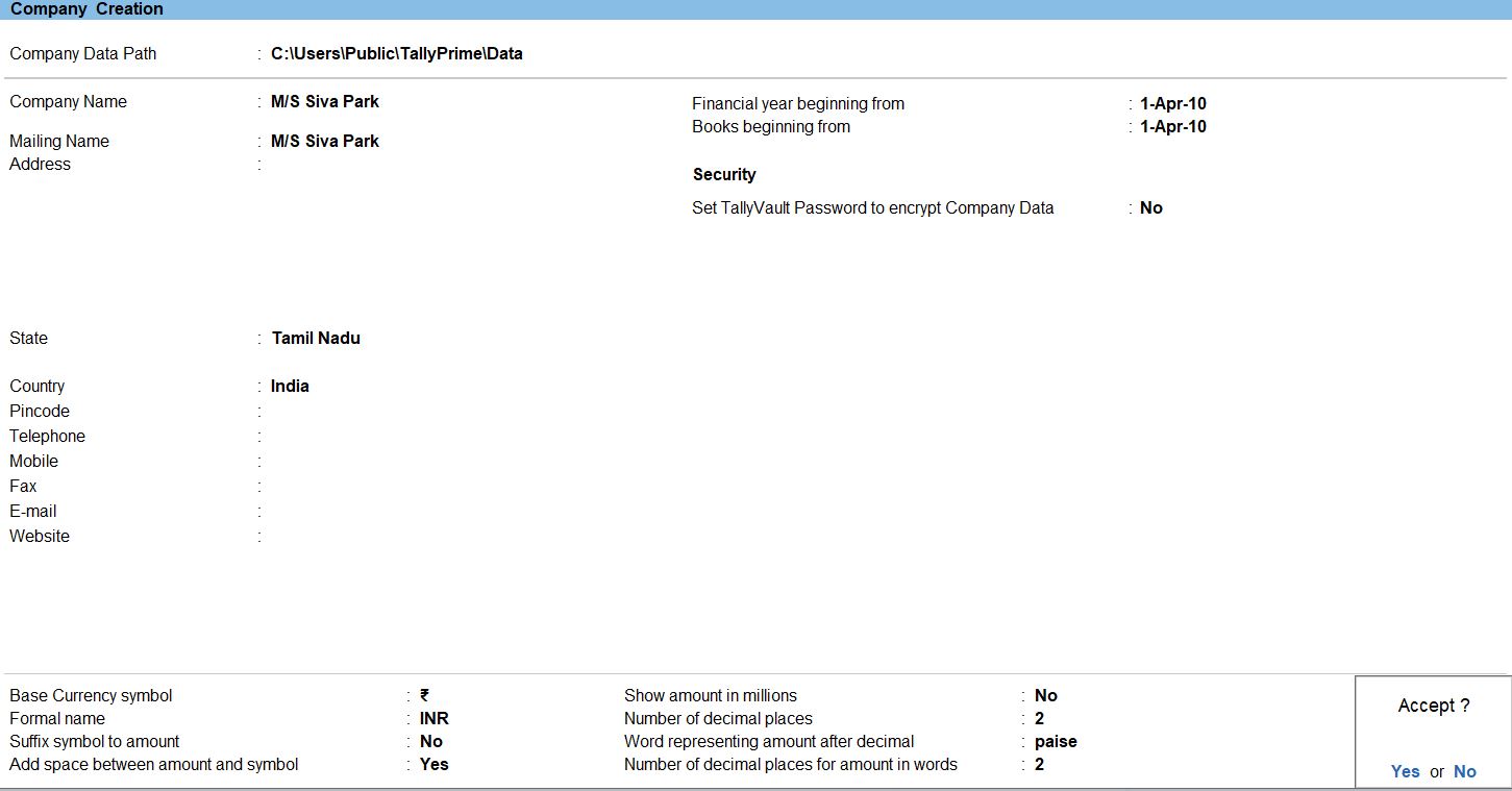 - Select "Create Company" or "Company Info" (exact wording may vary based on your version).